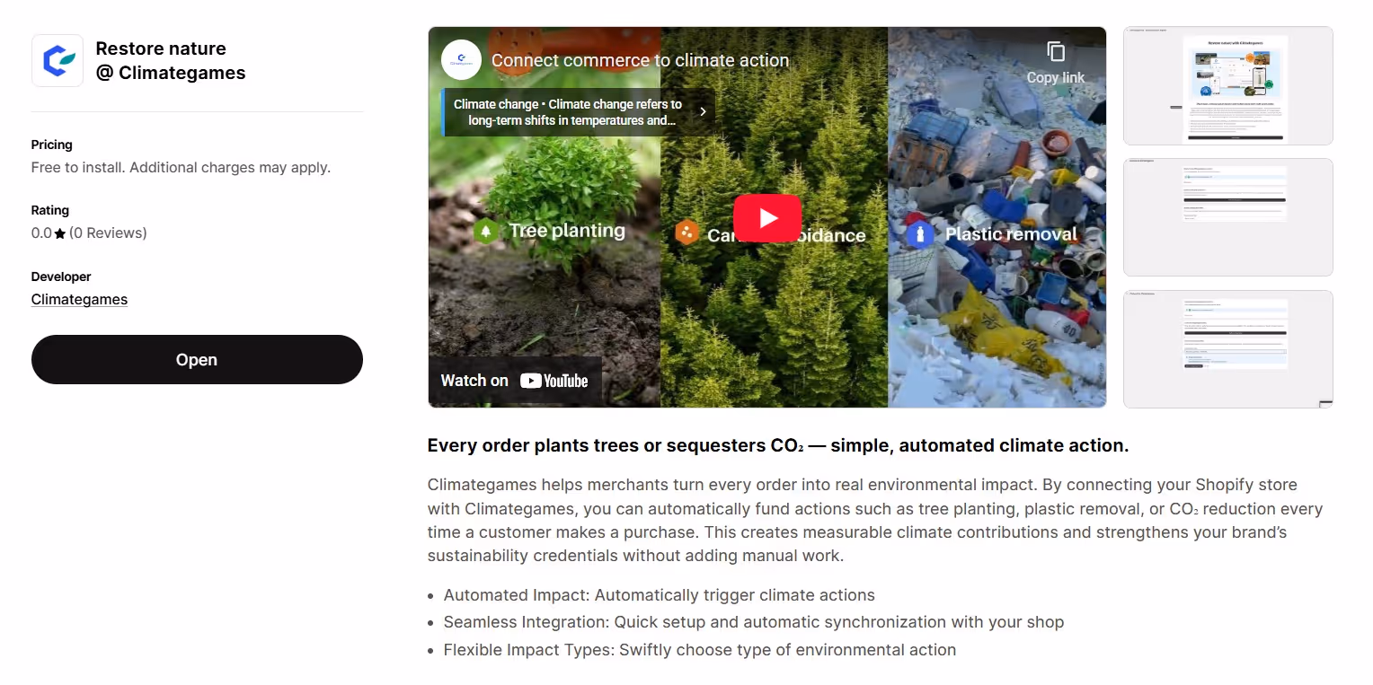 If you have a Shopify account, connect with the Shopify integration purchases directly to environmental action with a simple setup. For those without a Shopify account, the ClimateGames API seamlessly integrates with your website. Check out API documentation for more information. You need to create a ClimateGames business account to use both the API and Shopify integration. The Shopify integration will be available in the next few months.